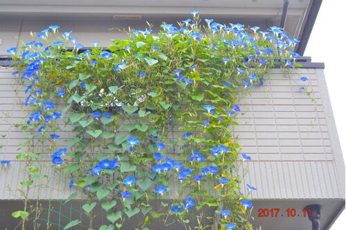 蔓はどうやら伸び切った感じです。 ツボミは付いている数だけ咲きます! 1/3 は種製作中です!(早く固まらないと霜で駄目になっちゃう ) 今日夜勤から帰ってきた午前11時頃のヘブンリーブルーの様子です この朝顔が一番高い場所に咲く花です。 もう、明日…