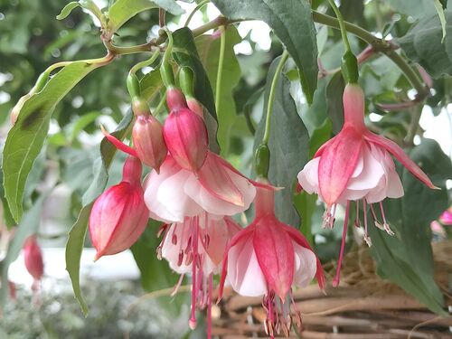 №1006 【SUNTORY Flowers:サントリー フラワーズ」社が開発した「フクシア」を 始め沢山の花がホームセンターにも並んでいます 「フクシア」は夏に強く、比較的育てやすい植物です。 「富士花鳥園」でフクシアの魅力にやられてしまい ピンク系のフクシアを…