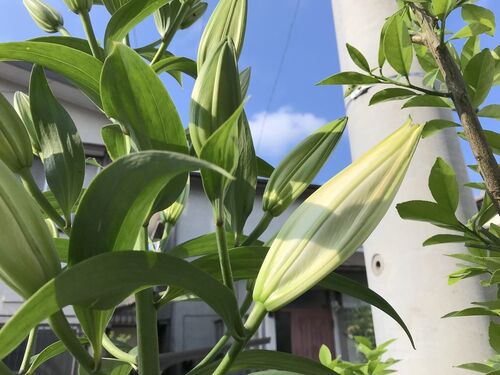 №1021 たくさん蕾を付けた白百合が、明日咲くかもしれません 21個も蕾を付けて、果たして最後の花まで咲かせることが出来るんでしょうか? 茎(というより幹)も太くて固く、自立でも大丈夫な勢いです。 楽しみです 百合「父さん!? 山の上の花ばかり…