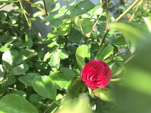 No.1196(2020-04-26) お隣さんから頂いた小花の赤いが一個だけ!咲きました\(^o^)/ もちろん、蕾は何百と出来ているようです! ほんの小さな枝を頂いて、挿し木にしてから3年目。 若い枝も出るわ、シュートも何本も何本も出ていますし範囲も広がって…