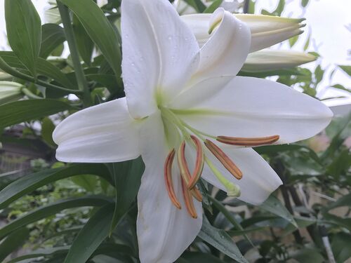 No.1219 2本から3本へと増えた「オリエンタル・ハイブリッドリリー」。 残念なことに開花した日が「☂雨」でした 真っ青な空をバックに真っ白な花と、少し薄めの程良い香りを味わいたかったなぁ。 雨の日なので花粉が閉じていますね。 ざっと3本の蕾を…