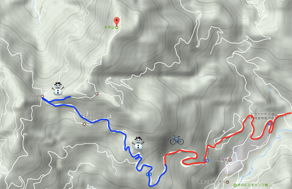 青い線は雪が道脇に積もっていたエリア。