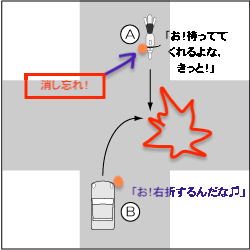 バイクの人「お!あの車右折するんかぁ、俺は直進だから(点けっ放し)、俺が