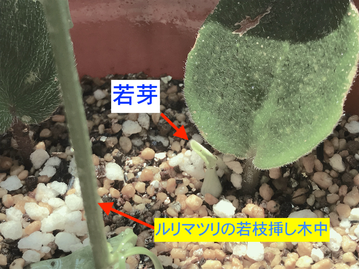 そして先程、優しく根本に水を上げようとしたら・・・「?何か出っ張ってるぞ?」と、眼鏡なしでは良く見えない私の眼に「ぼんやり」と若芽🌱らしいものが!!