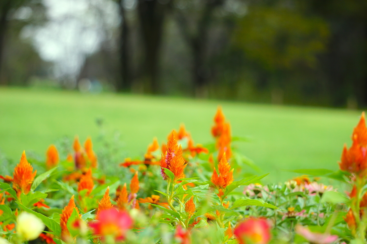 背丈の低いケイトウですが、自分がしゃがんで撮るとバックの芝生との相性がよく